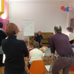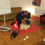 Natürlich gab es auch praktische Wiederbelegungsübungen mit Herz-Druck-Massage und einem Einsatz des Laien-Defibrillators. Dafür war Herr Peter Scherer anwesend, der Lehrer an der Rettungsakademie ist.